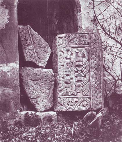 Fragments de dalle d’autel ou d’ambon, quelques-uns des rares vestiges de l’église collégiale de Moutier-Grandval, 7e-8e siècle, perdus. Calotype d’Edouard Quiquerez, 1859. Musée jurassien d’art et d’histoire, Delémont.