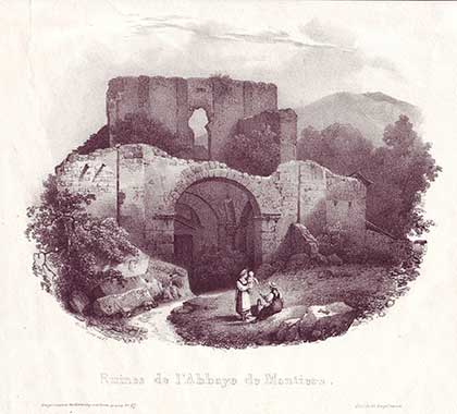 Ruines de l’Abbaye de Moutier – Gravure de Jules Louis Frédéric Villeneuve, 1824.
