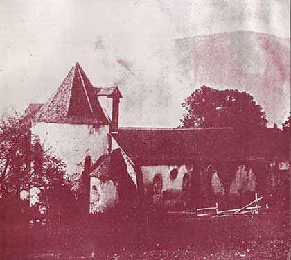 L’église collégiale de Moutier-Grandval en ruine. Calotype d’Edouard Quiquerez, avant 1859, extrait d’un manuscrit de son père Auguste(Monuments de l’ancien Ev.ch. de B.le. Eglises, 1853-1876). Universitätsbibliothek Basel, Mscr. H.1.23.