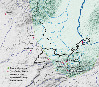 Dès le Haut Moyen Age, la vallée de Delémont est englobée dans un district de production du fer qui, à cette époque, est d’une grande importance au niveau européen (Eschenlohr 2001). Il convient, de ce fait, de placer la transformation et le travail du fer exécutés dans leur enchaînement technologique et spatial au sein même de ce district, à Develier-Courtételle. Au début du Moyen Age, la zone étudiée, renfermant des témoins de cette production, s’étend du Sornegau, soit du bord occidental de la vallée de Delémont à l’extrémité orientale du Val Terbi et, du nord au sud, depuis le plateau de Pleigne jusqu’au vallon du Chaluet (CAJ14).